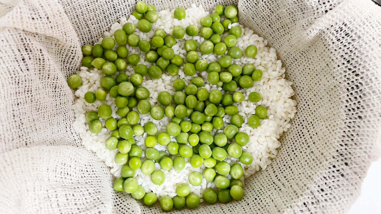 ③ もち米2合を蒸し器で45分蒸し、グリーンピースと合わせて市販のお揚げに詰める