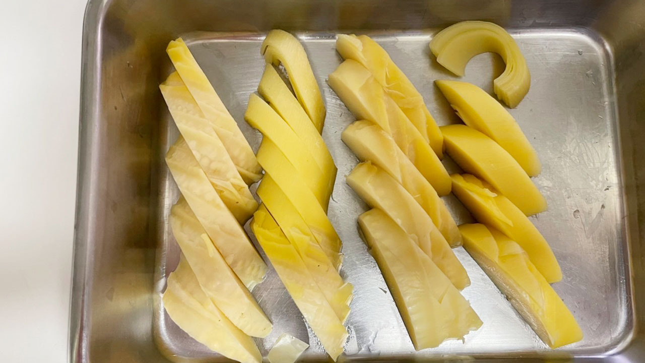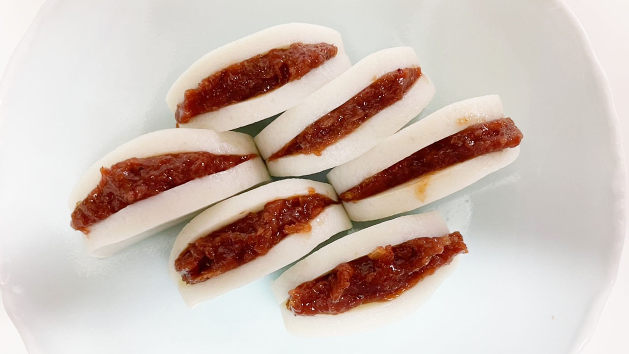① 皮ごと米糠で柔らかなるまで茹で、お好みの大きさに切っておく