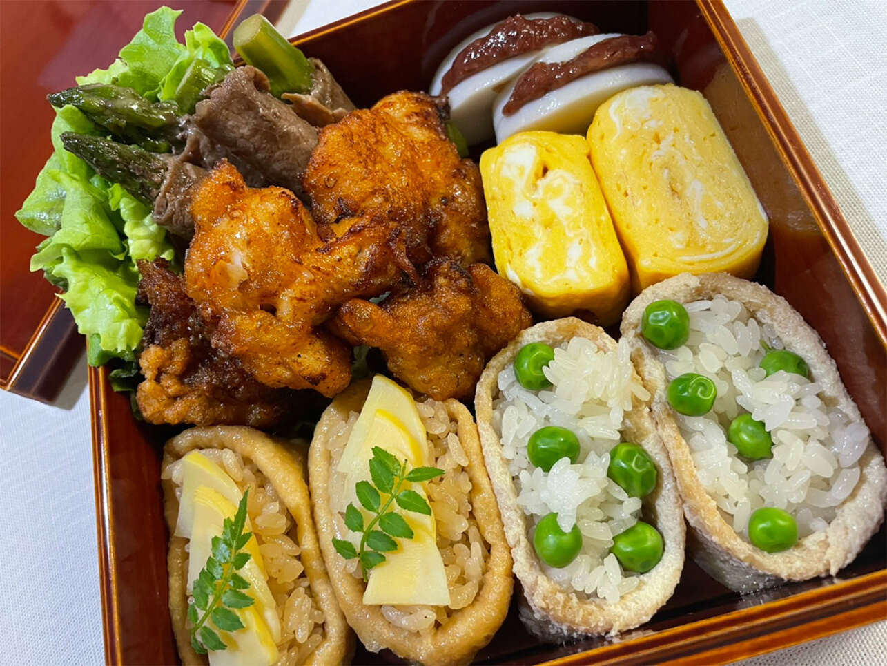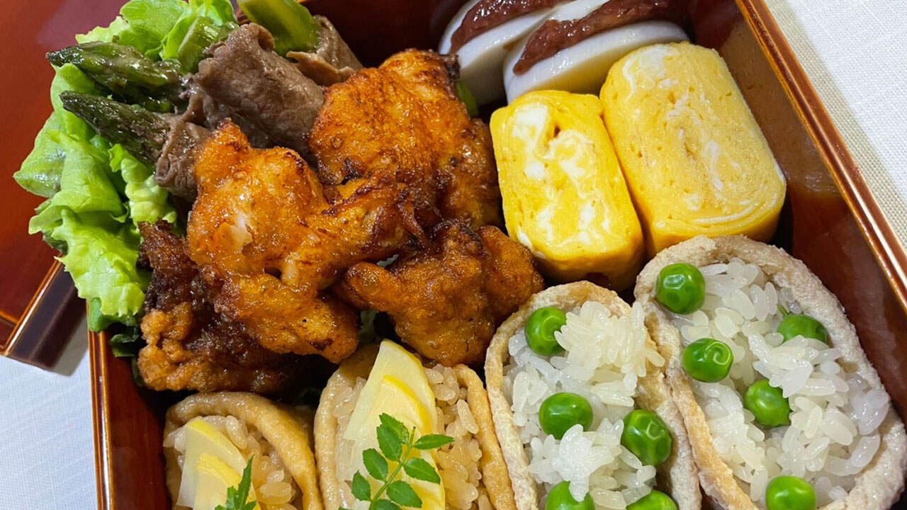 【お父さんのお花見弁当】郡司パパレシピ★稲荷寿司(筍ご飯とグリンピースご飯)