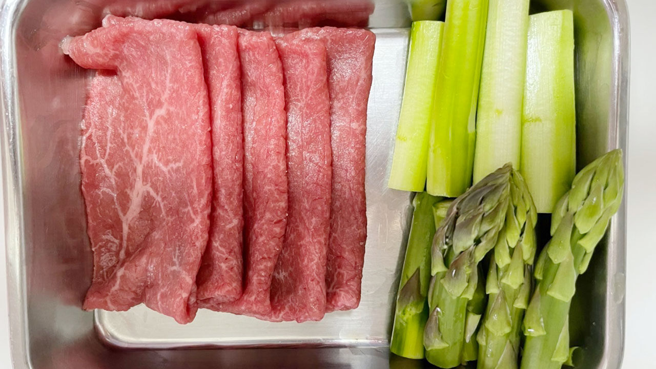 唐揚げ、卵焼き、アスパラの牛肉巻き、蒲鉾の梅肉挟み、トマトを詰めました。