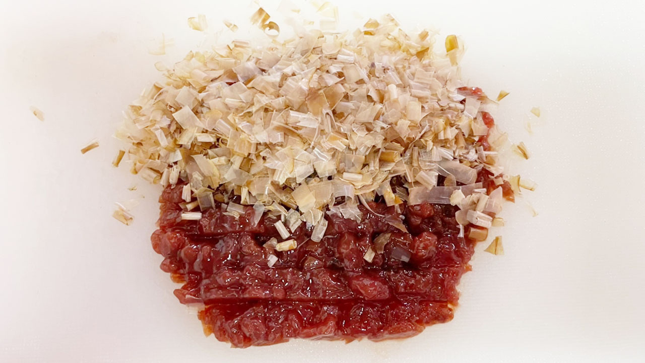 ③ 出来上がった筍ご飯をお揚げに詰め山椒をのせる