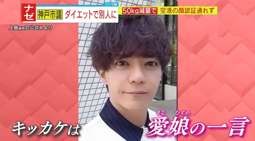 上畠市議の体重は元々115kgあったそうなんですが、当時5歳だった娘さんからの「痩せないと結婚しない」という言葉が胸に刺さって、1日3合食べていたご飯を娘さんの小さな茶碗で食べるくらいに減らし、お菓子やカップ麺を止めるなどの食事制限と、週に3回1時間の筋トレを行い、1年3か月で約50kgの減量に成功、一時は65kgにまでなったそうです。写真を見ると髪形なども変わって、大きくイメージチェンジしています。