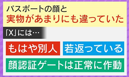 そのワケは、パスポートの顔と実物があまりにも違っていたからだそうで、Xには、「もはや別人」「若返っている」「顔認証ゲートは正常に作動」などの書き込みがありました。