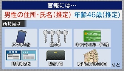 しかし、男性の所持品にはスマホ1台・鍵4本・キャッシュカード1枚・診察券2枚・財布1個・現金5万1893円などがありました。また、『官報』には、男性の住所・氏名(推定)・年齢46歳(推定)まで記されていました。