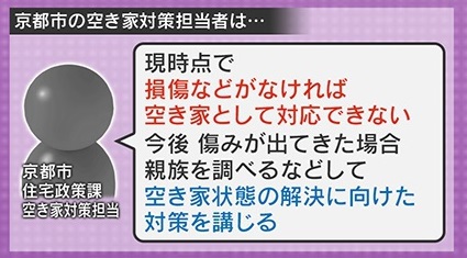 京都市住宅政策課の空き家対策担当者は、「現時点で損傷などがなければ、空き家として対応できない。今後、傷みが出てきた場合、親族を調べるなどして空き家状態の解決に向けた対策を講じる」としています。