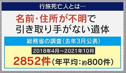 『行旅死亡人』とは、名前・住所が不明で、引き取り手がない遺体のことです。総務省の調査(2023年3月公表)によると、2018年4月~2021年10月までに2852件(年平均・約800件)あったといいます。