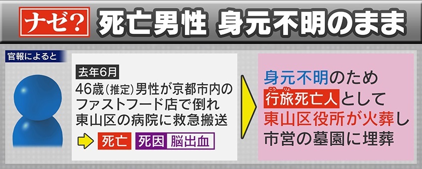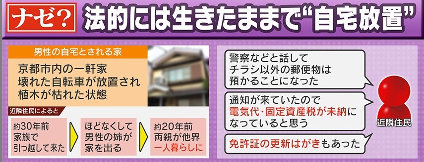 「2023年6月、こちらの家に住んでいたとみられる40代の男性が京都市内で倒れ、亡くなりました。しかし、身元が確認できないことから、『行旅死亡人』として扱われたということです」