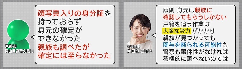 名前・住所が判明していても身元不明のままである理由について、京都市東山区役所の職員は「顔写真入りの身分証を持っておらず、身元の確定ができなかった。親族も調べたが、確定には至らなかった」と話しています。