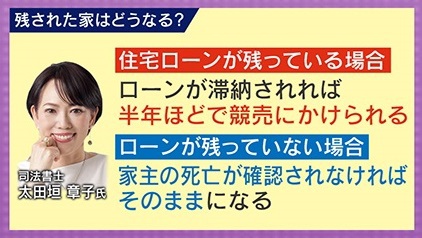 司法書士・太田垣氏によると、残された家については「住宅ローンが残っている場合、ローンが滞納されれば半年ほどで競売にかけられる。ローンが残っていない場合、家主の死亡が確認されなければ、そのままになる」ということです。
