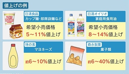 値上げの例ですが、『日清食品』のカップ麺・即席袋麺などは希望小売価格から5~11%、『日清オイリオ』の家庭用食用油が8~14%、『味の素』のマヨネーズは約6~10%、『森永製菓』の菓子類は約6~40%の値上げとなっています。