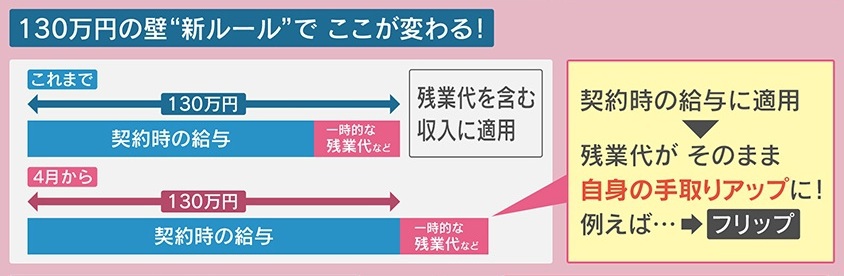 そんな中、『130万円の壁』に“新ルール”が追加されました。これまでは契約時の給与に一時的な残業代などを合わせて130万円を超えるか否かということでしたが、4月からは、“契約時の給与のみ”で判断することになり、残業代などは、そのまま自身の手取りになるということです。