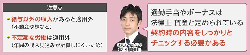 しかし、このルールには注意点もあります。給与以外(不動産や株など)の収入がある場合と、不定期な労働は、年間の収入見込みが計算しにくいため適用外となります。経営コンサルタントの坂口氏によると、「通勤手当やボーナスは法律上、賃金と定められている。契約時の内容をしっかりとチェックする必要がある」ということです。