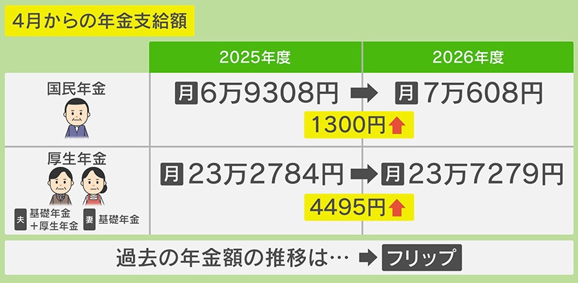 4月からの年金支給額は、『国民年金』の場合、2025年度は月6万9308円でしたが、2026年度には、月7万608円と、1300円上がります。