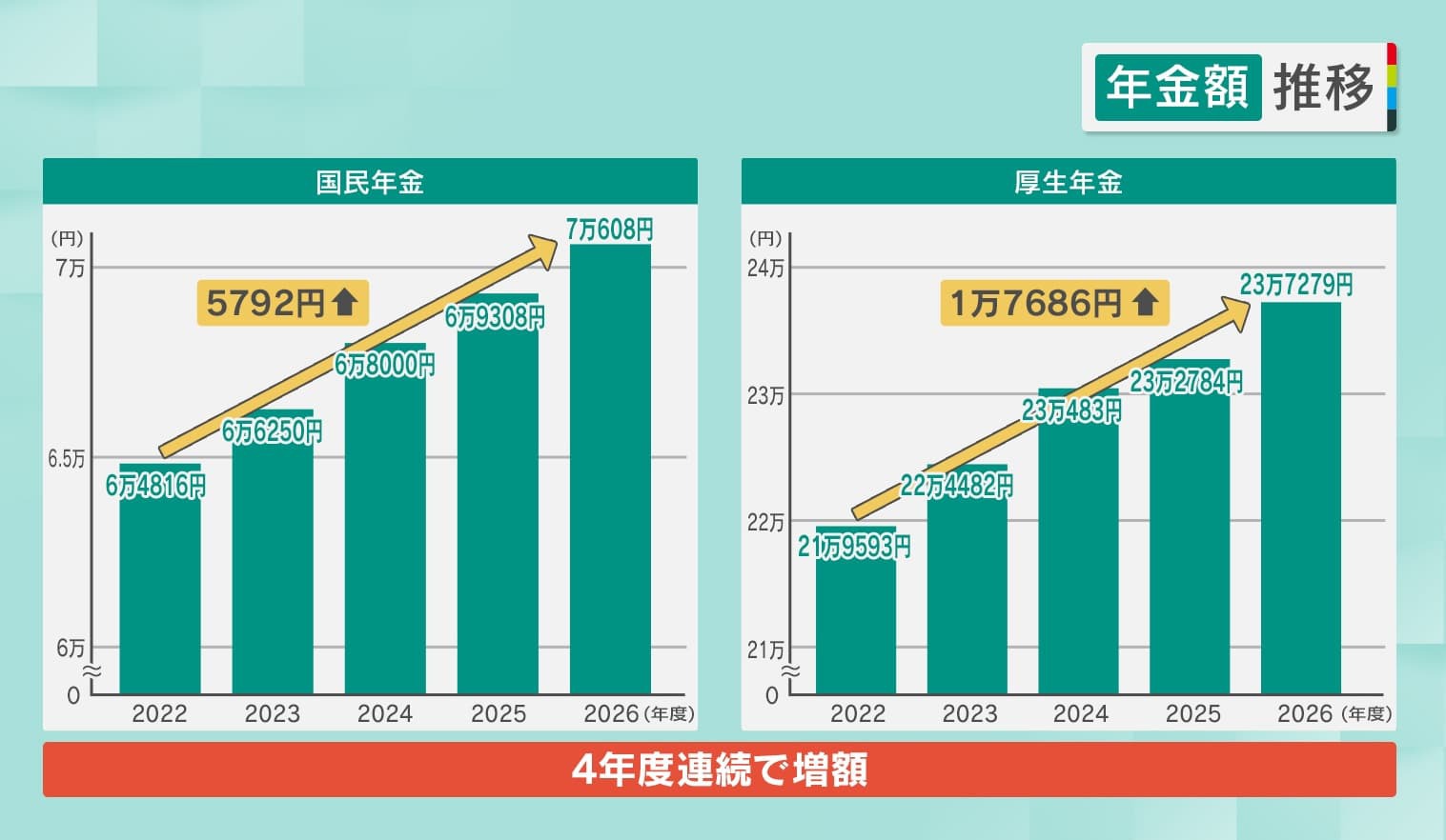 年金は4年度連続で増額しています。『国民年金』でみてみると、2022年~2026年の間に、5792円増額されています。そして『厚生年金』だと1万7686円増額されています。