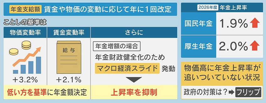 これにより、2026年の年金上昇率は、『国民年金』が1.9%、『厚生年金』は2.0%アップとなりました。