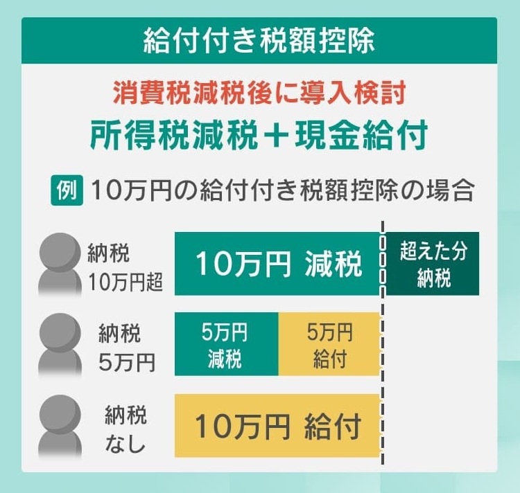 そして、消費税減税後に導入を検討しているのが、『給付付き税額控除』で、所得税減税と現金給付を組み合わせたものだといいます。例えば10万円の給付付き税額控除の場合、納税が10万円を超えている人は、まず10万円が減税され、超えた分を納税します。納税が5万円の方は5万円が減税され、5万円を給付でもらうことができます。納税なしの方は10万円が給付されるということです。
