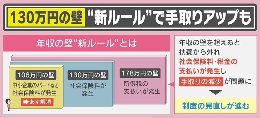 そして『年収の壁』にも新しいルールが追加されました。中小企業のパートなどに社会保険料が発生する基準の『106万円の壁』については、3月31日に解消されました。