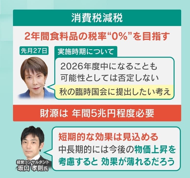 政府の物価高対策ですが、まず消費税減税は2年間食料品の税率0%を目指しています。2月27日、高市首相は実施の時期について「2026年度中になることも可能性としては否定しない。秋の臨時国会に提出したい考え」を示しています。ただ、財源は年間5兆円程度が必要だということです。坂口氏によると「短期的な効果は見込めるが、中長期的には今後の物価上昇を考慮すると、効果が薄れるだろう」ということです。