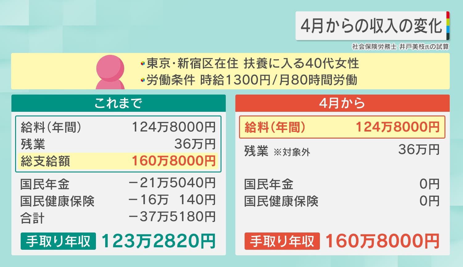 4月からの収入の変化を例で見てみると、扶養に入っている40代女性が、時給1300円で月80時間労働していた場合、これまでは、給料124万8000円と残業代36万円で、総支給額は160万8000円でした。130万円を超えているため、扶養から外れ、国民年金や国民健康保険で合計37万5180円が引かれ、手取り年収は123万2820円となっていました。