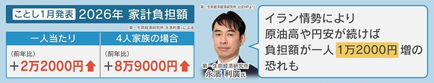 『第一生命経済研究所』の永濱利廣氏によると、1月に発表された2026年の家計負担額は、一人当たり、前の年より2万2000円上がり、4人家族の場合は、8万9000円上がると発表されました。そして「イラン情勢により、原油高や円安が続けば、負担額が一人当たり1万2000円増える恐れもある」ということです。