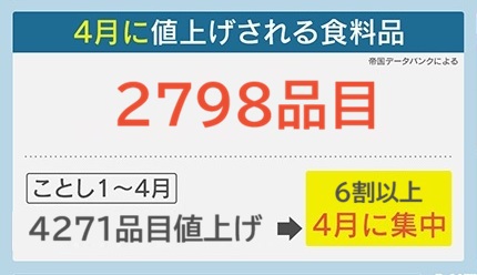『帝国データバンク』によると、4月に値上げされる食料品は2798品目です。2026年1~4月には4271品目が値上げされていて、6割以上が4月に集中しています。