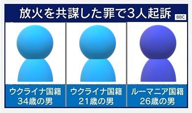 イギリス捜査当局は、放火を共謀した罪で3人を起訴しています。ウクライナ国籍の男性2人と、ルーマニア国籍の男性1人です。