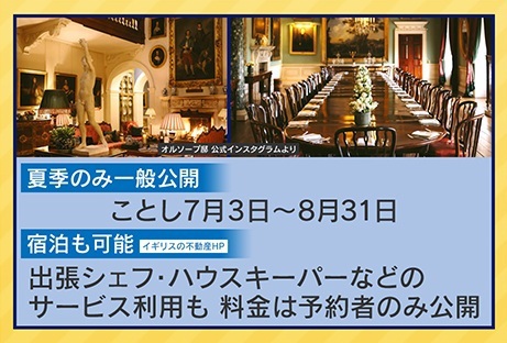 実は、このオルソープ邸は、夏季のみ一般公開されていて、2025年は、7月3日~8月31日まで公開されています。さらに宿泊も可能ということで、出張シェフ、ハウスキーパーなどのサービスを利用することもできます。しかし、料金は予約者のみに公開されるということです。