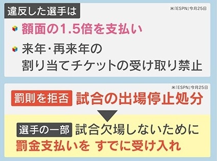 違反した選手には『額面の1.5倍を支払い』『来年・再来年の割り当てチケットの受け取り禁止』の罰則があり、罰則を拒否した場合は出場停止処分に。試合を欠場しないために、選手の一部は罰金支払いをすでに受け入れたということです。
