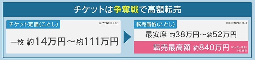 そんな大注目イベントのチケットは争奪戦で、高額転売されました。『ESPN』によると、定価は一枚約14万円~約111万円ですが、転売価格(2025年)は最安席で約38万円~約52万円。『ロイター通信』によると、転売最高額は約840万円だったということです。