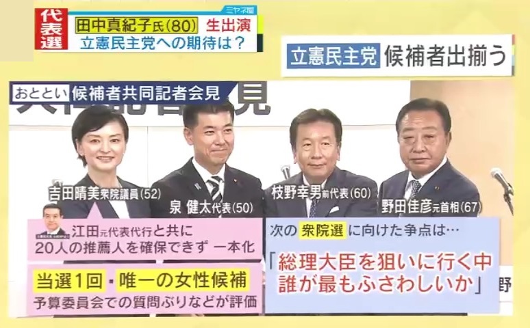 その証拠に、江田憲司さんが「自分のほうが党内で票があったけど、女性とバランスを取るという党是からして女性候補がいなければいけないから、僕は譲ります」と言って、握手しておられました。