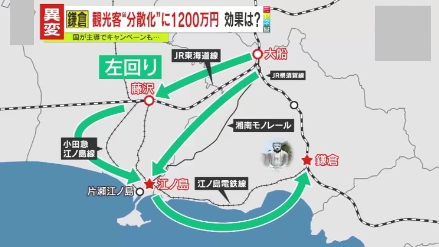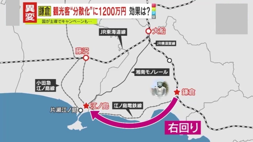 歴史的遺産や、豊かな自然に恵まれた鎌倉・江の島エリア。年間の観光客数約3100万人。日本屈指の観光地として賑わいを見せ、経済が回る一方で、観光客による過度な混雑や違反行為が相次ぎ、オーバーツーリズムが問題視されてきました。そこで対策として2024年11月から2025年2月にかけ、国交省が推奨してきたのが、観光客の流れを分散させることです。