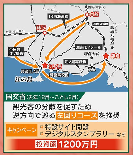一方、国交省が勧めるのは、藤沢駅や大船駅から江の島方面へ行き、その後、鎌倉方面へ行く左回りのルート。人の流れを分散させ、混雑を減らす狙いです。
