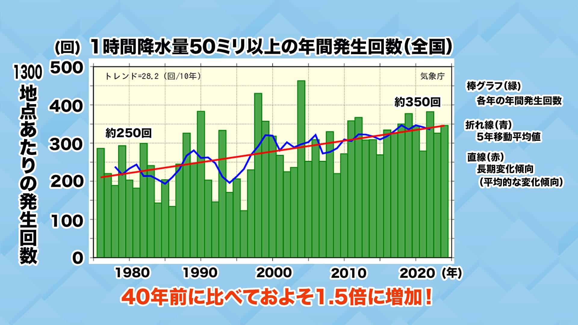 緑の縦グラフが1年ごとの回数で、青い線が5年平均、赤い線が全体の傾向となっています。80年代前半では約250回で、2020年からの5年間は約350回なので、40年前に比べると、約1.5倍に増加しています。