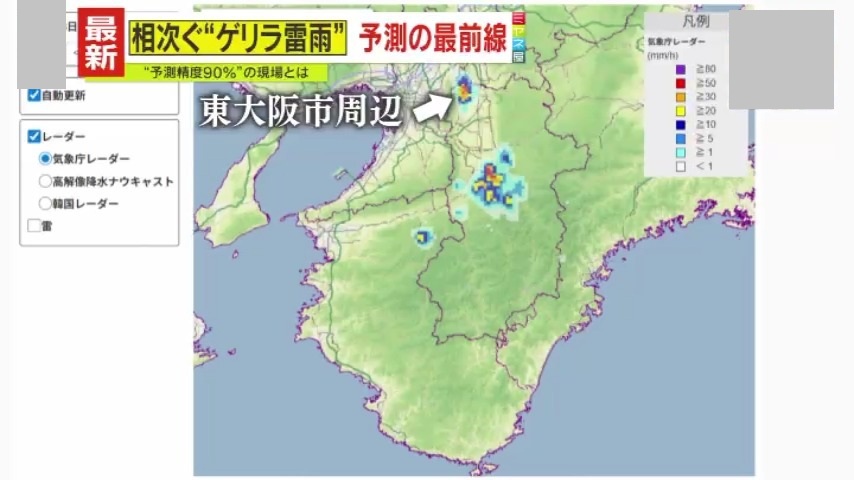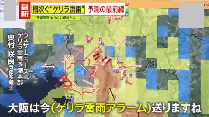 「あっ、大阪周辺も今ちょっと…生駒山地の辺りで雨雲が湧いて、黒っぽい雲も見られています。今から大阪にゲリラ雷雨アラームを送ります」