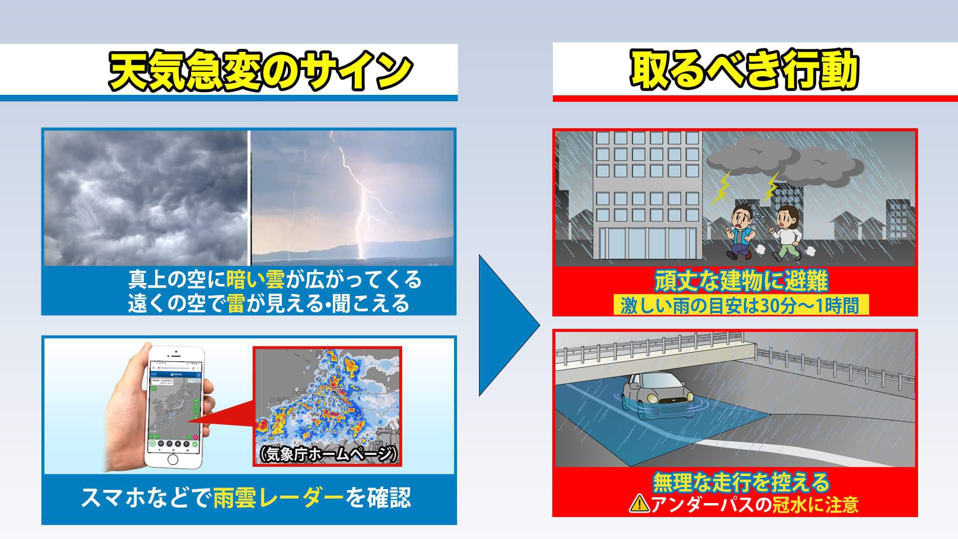 ゲリラ雷雨は、自分で“感じる・気付く”ということも大事だということで、真上に暗い雲が広がってくる、また風が強くなってくるというのも、天気急変のサインです。『ウェザーニューズ』や、気象庁の『雨雲レーダー』なども使って、頑丈な建物に避難したり、車の走行に注意したりするようにしましょう。