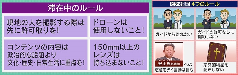 一方、滞在中は「現地の人を撮影する際は先に許可取りを」「コンテンツの内容は政治的な話より文化・歴史・日常生活に重点を」「ドローンは使用しないこと」「150mm以上のレンズは持ち込まないこと」、ビデオ撮影時には「ガイドから離れない」「ガイドの許可なしに撮影しない」「金正恩総書記への敬意を欠く言動は慎む」「宗教的物品を配布しない」といったルールがありました。