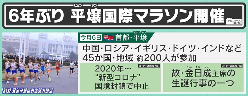 『聯合ニュース』によると、2025年4月6日、6年ぶりに平壌国際マラソンが開催され、中国・ロシア・イギリス・ドイツ・インドなど45か国・地域から約200人が参加しました。『ロイター通信』によると、故・金日成主席の生誕行事の一つですが、2020年からは新型コロナの国境封鎖で中止されていました。