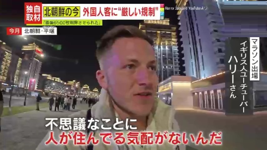 このツアーに参加したイギリス人のハリー・ジャガードさんは、約233万人の登録者を持つ人気ユーチューバーで、平壌訪問で撮影した映像(約30分)を2本投稿。その映像にあったニュータウンは新しい高層マンションが立ち並び、夜にもかかわらず大音量の音楽がかけられ、一際にぎやかな雰囲気でした。