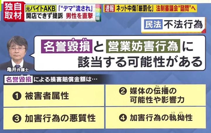 亀井弁護士によると、この様なネットでの誹謗中傷は民法で、「名誉毀損」と「営業妨害行為」に該当する可能性があるということです。名誉棄損による損害賠償の金額については『被害者の属性』、『媒体の伝播の可能性や影響力』、『加害行為の悪質性』、『加害行為の執拗性』などがポイントとなってくるということです。
