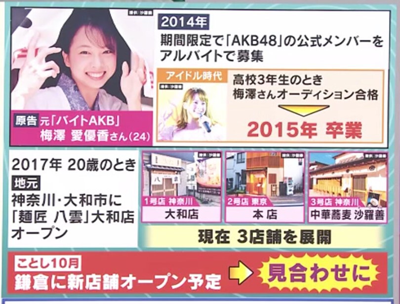 ネットで中傷被害を受けたとするのは、元「バイトAKB」の梅澤愛優香(うめざわ・まゆか)さん24歳。梅澤さんは、2014年に期間限定で募集された「AKB48」の公式アルバイトメンバーに選出され、翌年に卒業しました。2017年、20歳の時に、地元・神奈川県の大和(やまと)市に「麺匠・八雲(めんしょう・やぐも)」大和店をオープン。現在3店舗を展開しています。2021年10月に4店舗目をオープン予定で、新店舗の目玉は全店で初となる絹ごし麺、その名も「生の絹」。8月時点で、料理9割、店舗8割が完成していたという事でしたが、これが突如“見合わせ”となりました。