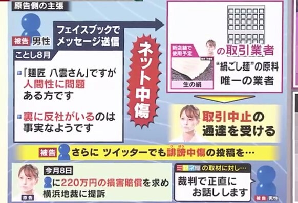 2021年8月、1人の男性がフェイスブックで、梅澤さんの取引先の業者に“あるメッセージ”を送ったのです。その内容は、「麺匠・八雲さんですが人間性に問題ある方です」、「裏に反社がいるのは事実なようです」という、事実無根の誹謗中傷でした。この取引業者は、お店の看板でもある絹ごし麺の原料を卸す唯一の業者でしたが、このメッセージを受け、梅澤さんは取引業者から取引中止の通達を受けたということです。