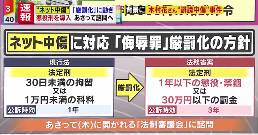 インターネット上の誹謗中傷への対応策として、法務省が刑法の「侮辱罪」を厳罰化する方針を固めたことがわかりました。