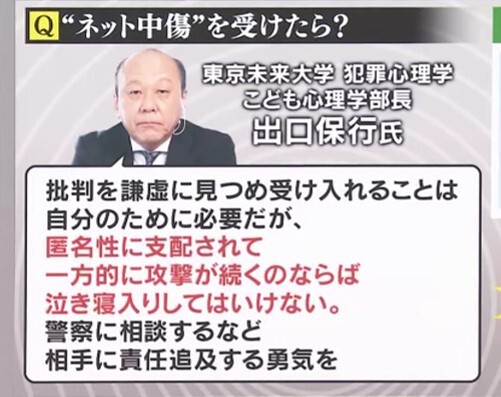 ネット中傷を受けた場合の対処法について、東京未来大学犯罪心理学こども心理学部長・出口保行氏は「批判を謙虚に見つめ受け入れることは自分のために必要だが、匿名性に支配されて一方的に攻撃が続くのならば、泣き寝入りしてはいけない。警察に相談するなど相手に責任追及する勇気を」とアドバイスしています。