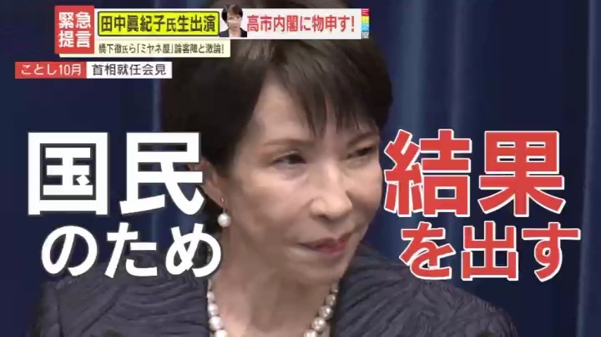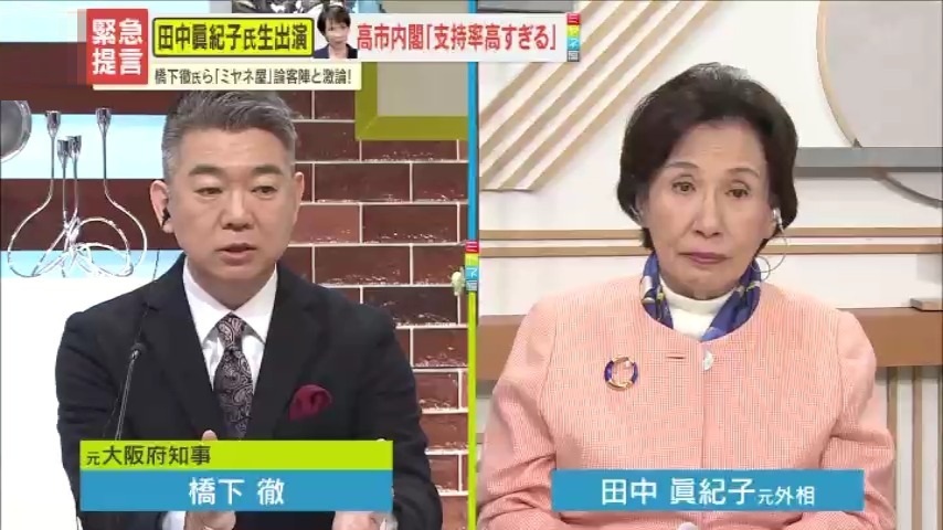 10月に発足してから、日中関係悪化など逆風の中でも高い支持率を維持する高市内閣。高市政権の評価と課題について、元外相・田中眞紀子氏と元大阪府知事・橋下徹氏が互いの持論をぶつけ合います。