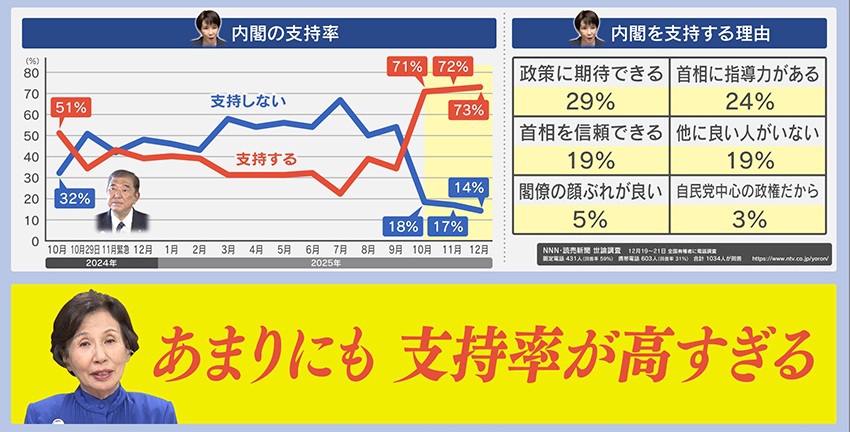 2025年10月に高市内閣が発足してから、支持率は70%超と高い水準を維持しています(NNN・読売新聞 世論調査)。支持する理由としては、『政策に期待できる』『首相に指導力がある』『首相を信頼できる』などが挙がっています。そんな高市内閣の支持率について、元外相・田中眞紀子氏は「あまりにも高すぎる」と指摘します。