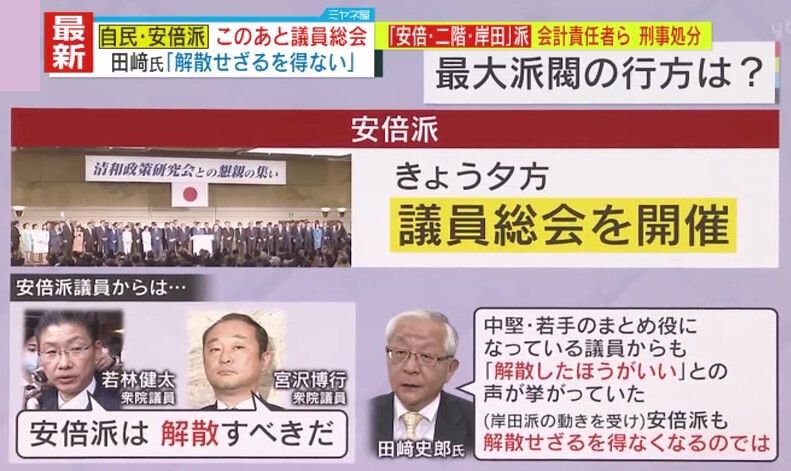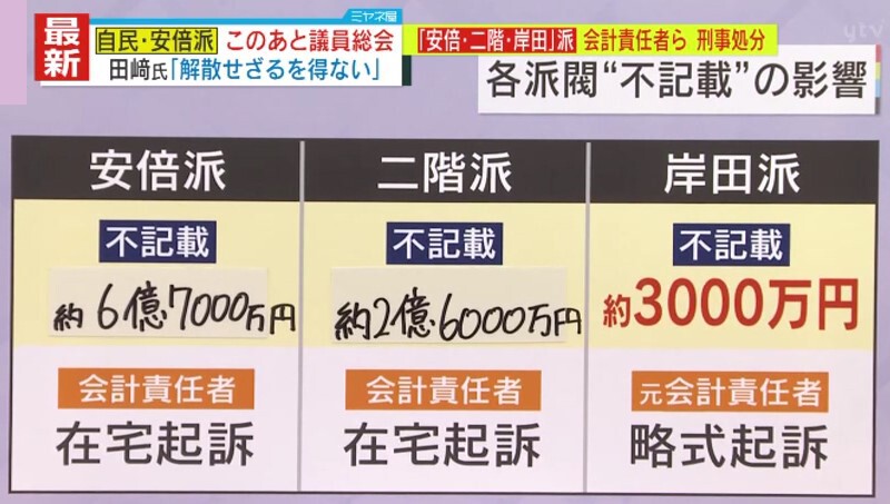 Q.岸田派の不記載は約3000万円、一方で安倍派が約6億7000万円、二階派が約2億6000万円ですが、“3000万円の岸田派”が解散するとなれば、金額の桁が違う他の2派閥は「当然、解散ですよね」という雰囲気になりますよね?