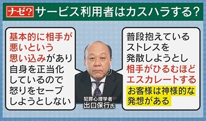 サービス利用者がカスハラする理由について、犯罪心理学者・出口保行氏は、「基本的に相手が悪いという思い込みがあり、自身を正当化しているので、怒りをセーブしようとしない。また、普段抱えているストレスを発散しようとし、相手がひるむほどエスカレートする。“お客様は神様”的な発想がある」と分析しています。