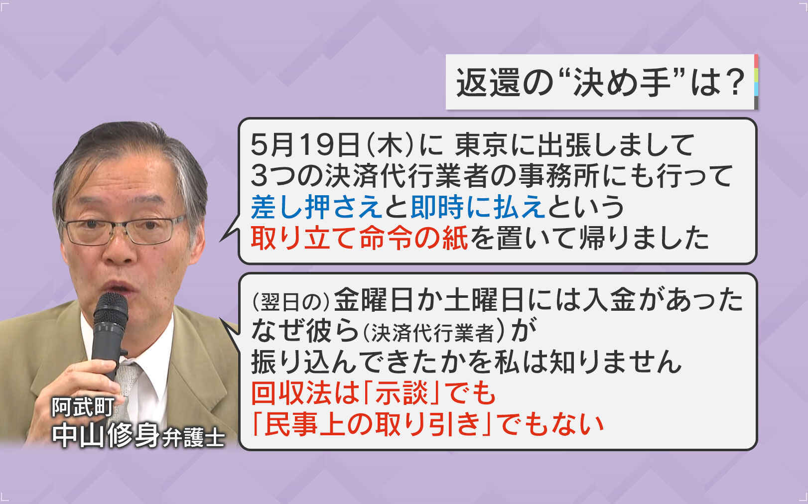 「中山弁護士によると、『5月19日に東京に出張して3つの決済代行業者の事務所にも行って、“差し押さえ”と“即時に払え”という“取り立て命令書の紙”を置いて帰った』とのことです。その後20日に入金があったのですが、中山弁護士は『なぜ決済代行業者が振り込んできたかを私は知りません。回収法は“示談”でも“民法上の取引”でもない』と言っています」