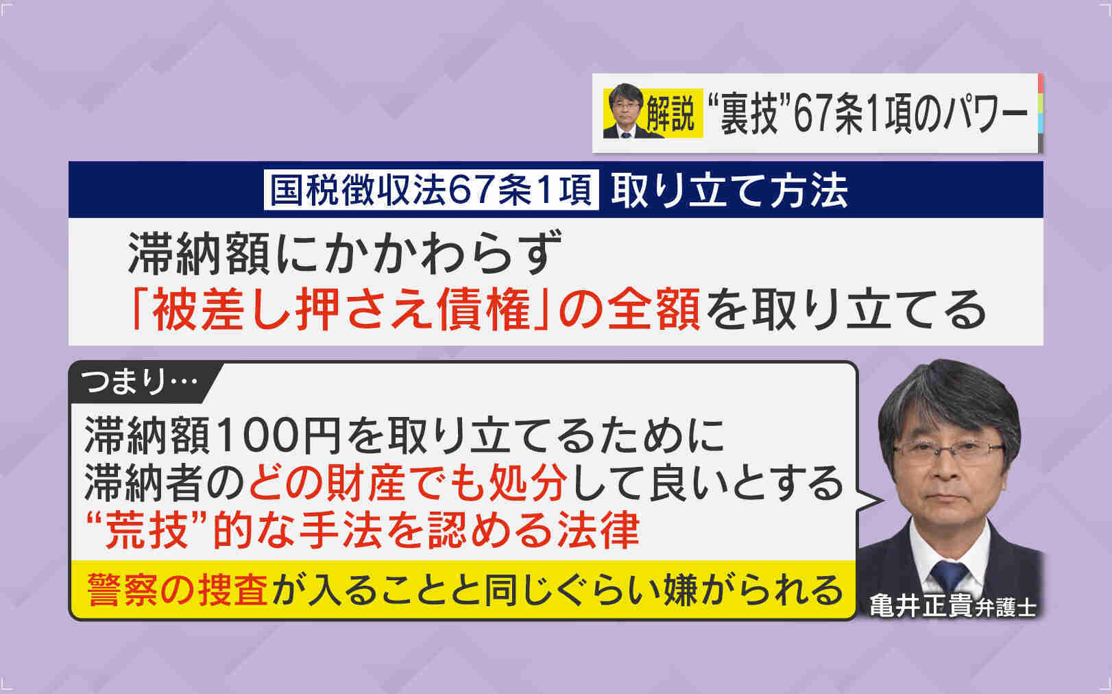 「亀井正貴弁護士によると、『国税徴収法67条1項をチラつかせたんじゃないか』と言います。これは『滞納額100円を取り立てるために、滞納者のどの財産でも処分して良いとする“荒業”的な手法を認める法律』で、『警察の捜査が入ることと同じくらい嫌がられる』とのことです」