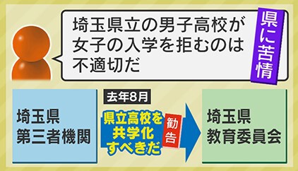 そもそもの発端は、「埼玉県立の男子高校が女子の入学を拒むのは不適切だ」と県に苦情が入ったことです。そして2023年8月、埼玉県の第三者機関が県立の男子校・女子校について、「共学化すべき」と埼玉県の教育委員会に勧告しました。